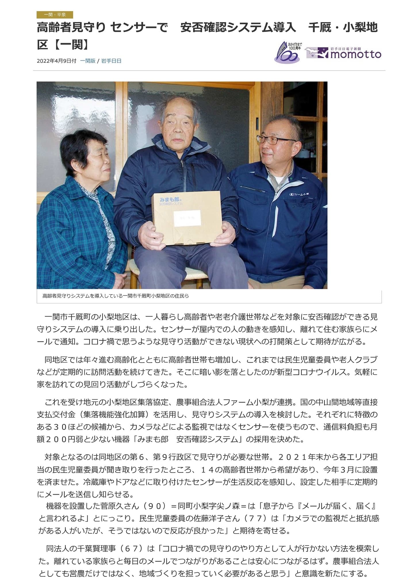 高齢者見守り センサーで 安否確認システム導入 千厩・小梨地区【岩手日日】